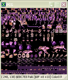 For the sprites themselves you must choose "View -> Video -> PCG". It will open a pop-up window, showing the sprites: